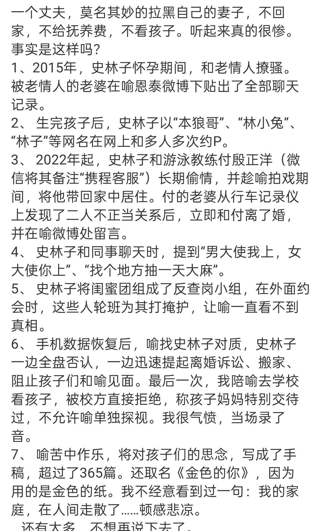 一查更是吓一跳,史林子生完孩子趁他外出拍戏,用多个账号在网上约会,2022 年还跟游泳教练勾搭上,甚至敢趁他不在家把情人领回家住。这事儿还是教练妻子离婚后才捅到喻恩泰面前的。他找史林子对质,对方不仅不承认,还倒打一耙,到处说他疑神疑鬼有问题。更过分的是,史林子抢先起诉离婚,带着孩子搬家藏起来,连学校都打招呼不让喻恩泰见孩子,他去学校蹲守都被老师拦住。
