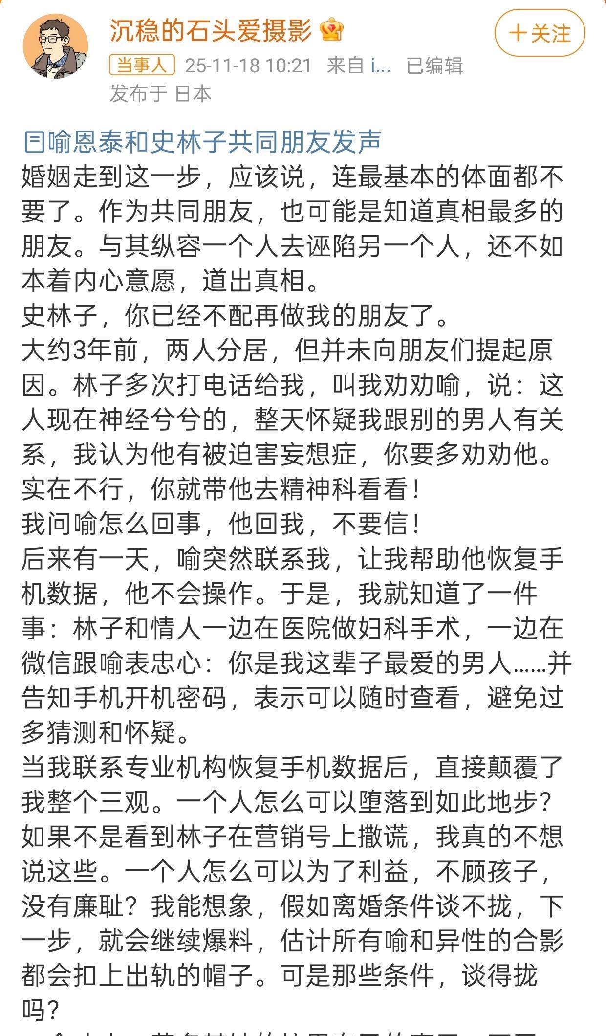 11 月中旬,卓伟一纸爆料把喻恩泰推上风口,说他对妻子不管不顾,不光长期不着家、不给抚养费,还偷偷转移财产,网友们跟着骂了整整一天。 没成想第二天剧情就彻底反转!喻恩泰一位好友写了长文替他辩解,还把女方史林子的一堆糟事给曝光了。好友透露,两人三年前就分开居住,起因是喻恩泰发现史林子出轨,手机聊天记录全是实锤。更离谱的是,2015 年刚结婚没多久,史林子就和前男友旧情复燃,被对方妻子抓包后,直接把暧昧记录贴到喻恩泰微博评论区,这才让他起了疑心。